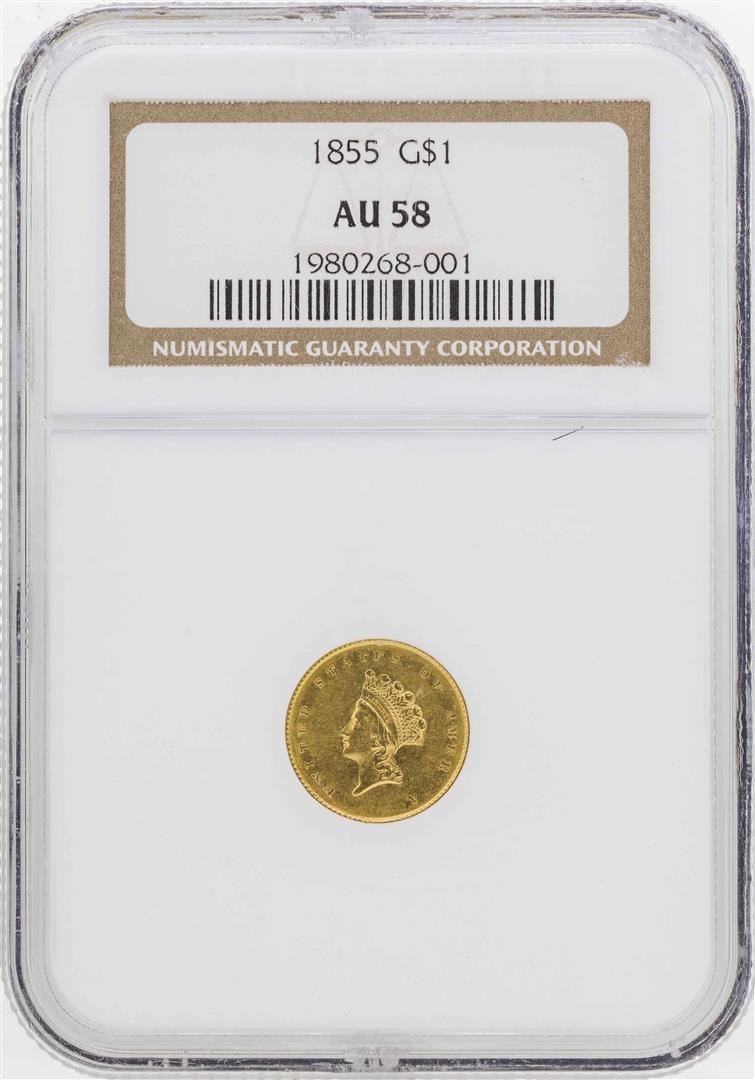 One 1855 $1 Indian Princess Head Gold Dollar Coin NGC AU58. NGC Certified.