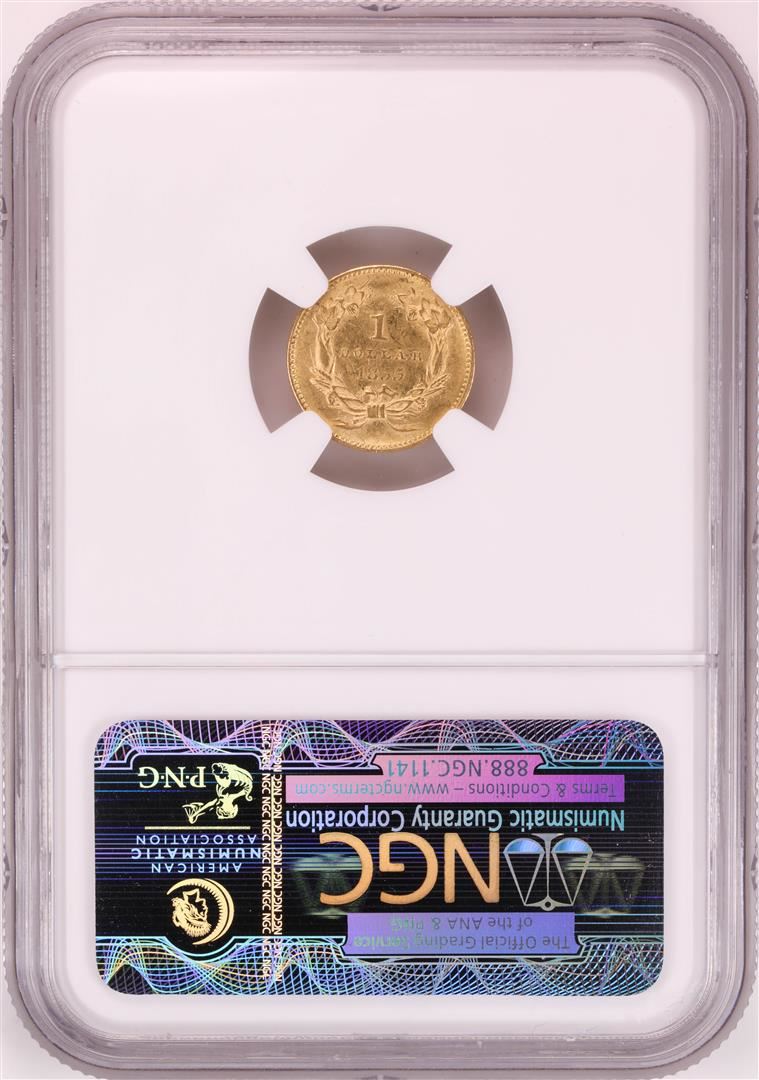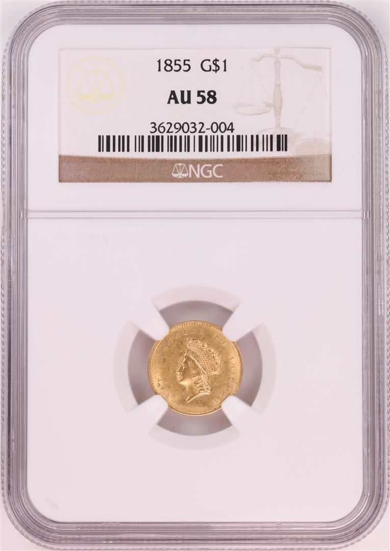 One 1855 $1 Indian Princess Head Gold Dollar Coin NGC AU58. NGC Certified.