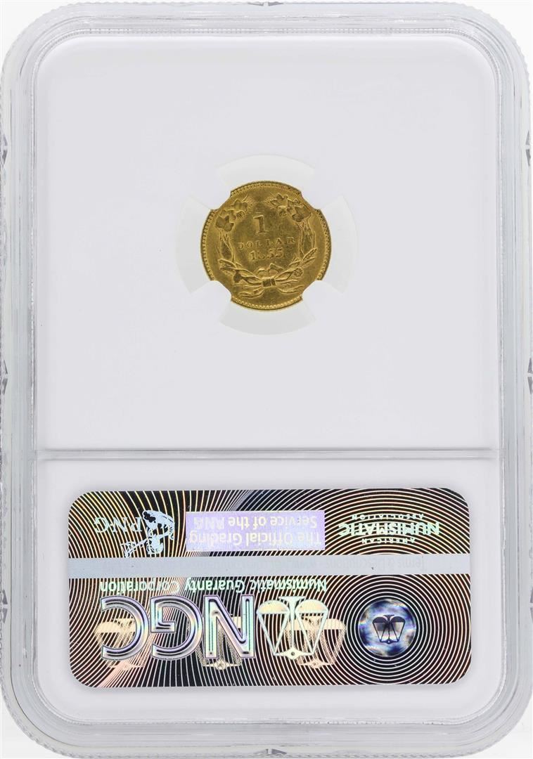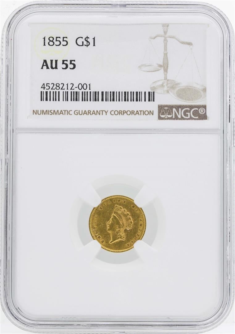 One 1855 $1 Indian Princess Head Gold Dollar Coin Type 2 NGC AU55. NGC Certified.