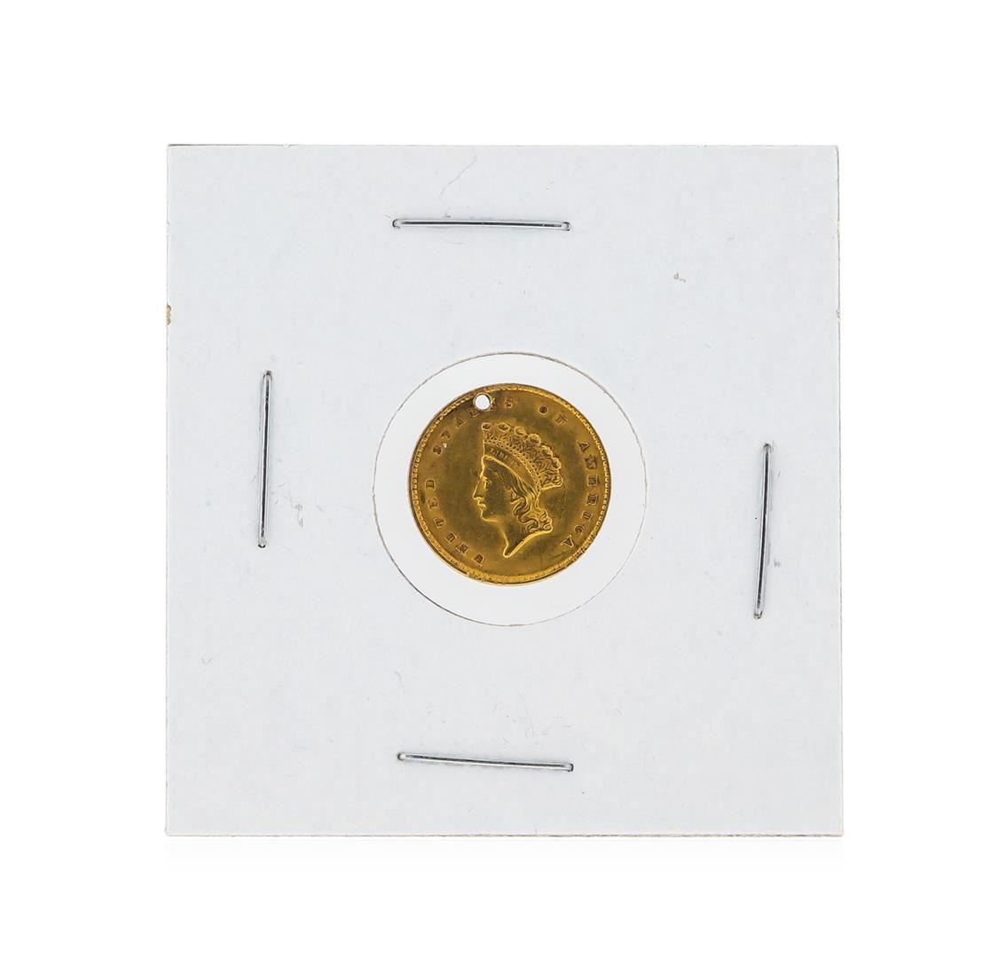 One 1855 $1 Indian Princess Head Type 2 Gold Dollar Coin with Hole.