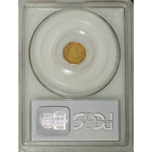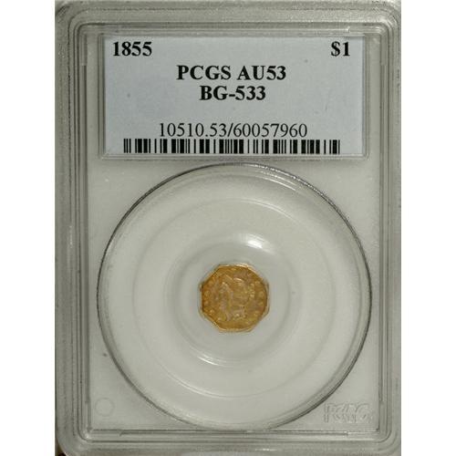<B>1855 $1 Liberty Octagonal 1 Dollar, BG-533, Low R.4, AU53 PCGS.</B></I> The only Nouizillet & Routhier Liberty octagonal dollar. Light, even friction is seen over the devices. The surfaces are generally orange-gold with pinkish accents over the highpoints.<BR><BR><b>Shipping:</b> Coins & Currency (<a target="_blank" href="http://www.heritageauctions.com/common/shipping.php">view shipping information</a>)
