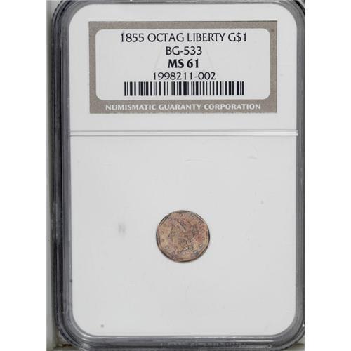 <B>1855<$1> Liberty Octagonal 1 Dollar, BG-533, Low R.4, MS61 NGC.</B></I> This piece has areas of blue and green as well as golden-brown. Highly lustrous with a typical strike and myriad tiny marks. Census: 4 in 61, 2 finer (9/06).