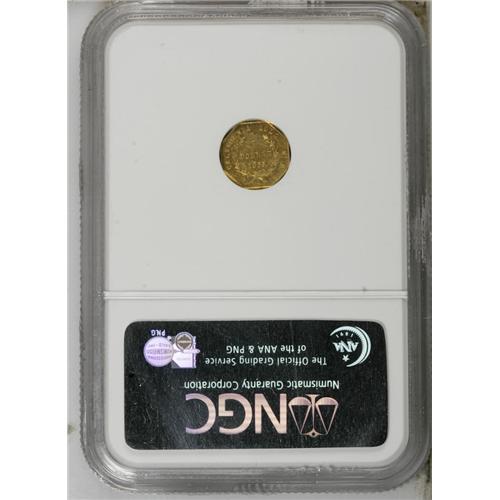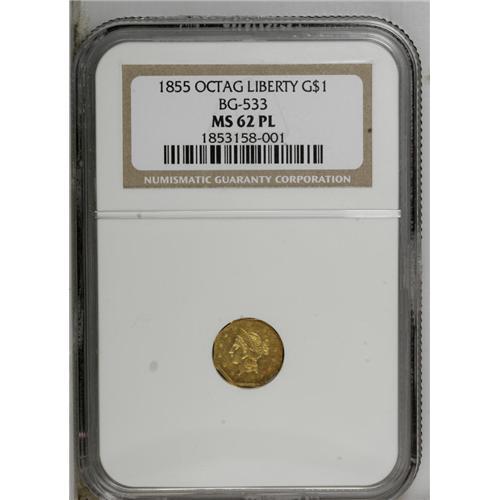 <B>1855 $1 Liberty Octagonal 1 Dollar, BG-533, Low R.4, MS62 Prooflike NGC.</B></I> A flashy Period One gold dollar with pumpkin-gold toning and a few wispy field grazes. Crisply brought up except for the bottom of the wreath and the upper stars.<BR><BR><b>Shipping:</b> Coin/Currency (<a target="_blank" href="http://www.heritageauctions.com/common/shipping.php">view shipping information</a>)