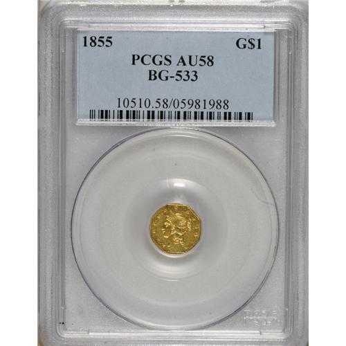 <B>1855 $1 Liberty Octagonal 1 Dollar, BG-533, Low R.4, AU58 PCGS.</B></I> PCGS Population (27/33). NGC Census: (3/6). (#10510)<BR><BR><b>Shipping:</b> Coins & Currency (<a target="_blank" href="http://www.heritageauctions.com/common/shipping.php">view shipping information</a>)