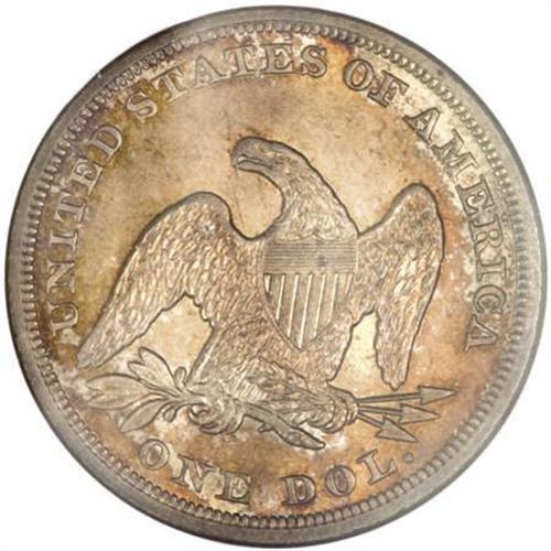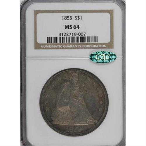 <B>1855 $1 MS64 NGC. CAC.</B></I> Paramount described the present coin as "the finest Uncirculated 1855 Seated Liberty dollar that we have seen" in its 1980 auction appearance, decades before the present coin was submitted to a grading service. The Paramount description elaborated, "Gem Uncirculated 65. A sensational specimen with rich golden-brown toning and lustrous, semi-prooflike surfaces that are amazingly free of bagmarks. Well struck and extremely attractive.<BR> "This date is very rare and underrated in strictly Uncirculated condition. Only 26,000 pieces were struck and auction records for choice specimens are virtually non-existent. The 1855 is significantly more rare in full Mint State than the 1853 or 1854, and is more often encountered in proof than in Uncirculated condition."<BR> Today, Census reports suggest that the 1854 and 1855 are roughly equal in rarity in Mint State, and the proof 1855 is approximately as rare as its Mint State counterpart. But more than 27 years after the Paramount description was published, they were correct about the present coin. This 1855 silver dollar has reclaimed its status as the single finest known.<BR> Luster shimmers throughout the splendid orange-gold surfaces. The strike is virtually full, and it requires a loupe and an experienced eye to locate only trivial incompleteness of detail on the eagle's left (facing) claw and Liberty's hair. We note concealed marks behind Liberty's head and on her left (facing) arm, but the overall preservation is exceptional. Census: 1 in 64, 0 finer (2/08).<BR><I>Ex: Auction '80 (Paramount, 8/1980), lot 806; 50th Anniversary Sale (Stack's, 10/1985), lot 225.</B></I><BR><I>From The Queller Family Collection of Silver Dollars.</B></I><BR><BR><B>Coin Engraver:</B> Christian Gobrecht<BR><BR><b>Shipping:</b> Coins & Currency (<a target="_blank" href="http://www.heritageauctions.com/common/shipping.php">view shipping information</a>)