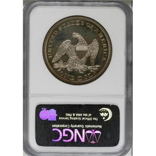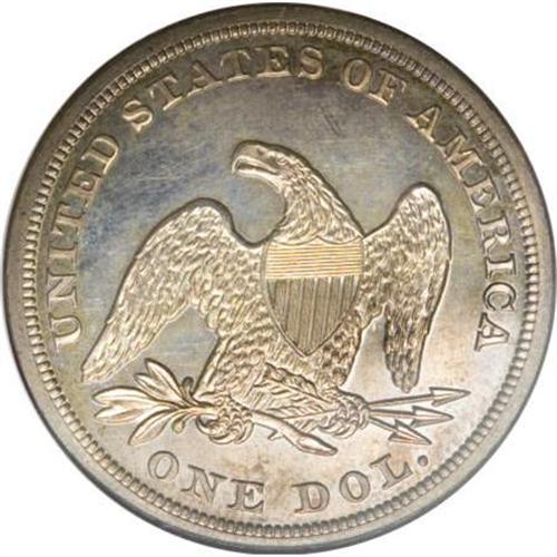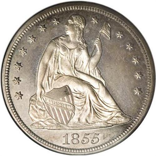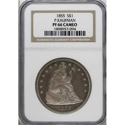 <B>1855 $1 PR66 Cameo NGC.</B></I> Ex: P. Kaufman. The 1855 proof dollar from the Kaufman Collection is the finest of five Cameo pieces certified by NGC or PCGS. It also shares with one other NGC PR66 the highest numerical grade of perhaps 15 to 25 extant specimens.<BR> There is considerable disparity among numismatists in the number of 1855 proof dollars minted, and the number of surviving specimens. Mintage estimates range from 30 to 75 coins, produced mainly for 1855 proof sets. Survival rates range from about 20 to as many as 60 examples.<BR> Our estimates of mintage and survival lean more toward the lower end of those ranges. We base this conclusion partly on certified population figures showing a total of 34 1855 proof dollars, some surely resubmissions or crossovers. Moreover, we have recorded approximately 40 sales over the past 20 years in our auction database, of which a number are "reappearances."<BR> The following 1855 proof dollar listing includes PR63 and finer examples. This grade range comprises the majority of certified coins, as well as auction appearances in our database:<BR><BR><B> 1. PR66 Cameo NGC. The Kaufman coin, </B></I>which appears to match none of the following examples.<BR><B> 2. PR66 NGC.</B></I> ANA World's Fair of Money (Heritage, 8/2007), lot 1728.<BR><B> 3. PR65 NGC.</B></I> Louis E. Eliasberg, Sr.; Eliasberg Estate (Bowers and Merena, 4/1997), lot 2223; Rarities Sale (Bowers and Merena, 8/1999), lot 255.<BR><B> 4. PR65 PCGS.</B></I> Sunshine Collection (Superior, 9/2003), lot 2093; Rod Sweet Collection (Bowers and Merena, 7/2005), lot 1016.<BR><B> 5. PR64 NGC.</B></I> New Netherlands Coin Co. (privately, 7/10/1944); John Jay Pittman (David Akers, 5/1998), lot 1687; Richmond Collection II (David Lawrence Rare Coins, 11/2004), lot 1520.<BR><B> 6. PR64 PCGS.</B></I> L.K. Rudolf Collection (Stack's, 5/2003), lot 2114.<BR><B> 7. PR63 NGC.</B></I> Worrell Collection (Superior, 9/1993), lot 1315.<BR><B> 8. PR63 NGC.</B></I> Pre-Long Beach (Superior, 10/2000), lot 4397; Allison Park Collection (American Numismatic Rarities, 8/2004), lot 587.<BR><B> 9. PR63 PCGS.</B></I> William A. LaBelle, Sr. Collection (American Numismatic Rarities, 7/2005), lot 1311.<BR><BR><BR>Additional Appearances<BR> A. PR64 PCGS. Kenneth C. Long Collection (Bowers and Merena (5/1995), lot 1228.<BR> B. PR64 NGC. Rarities Sale (Bowers and Merena, 8/1996), lot 234.<BR> C. PR63. Harry W. Bass, Jr. Collection I (Bowers and Merena, 5/1999), lot 2023.<BR> D. PR63. Norweb Collection (Bowers and Merena, 11/1988), lot 3804.<BR><BR> Mirrored fields accentuate the satiny motifs on both sides of this alluring Premium Gem, confirming the Cameo designation. A delicate mix of soft golden-beige and powder-blue patina displays whispers of subtle gold-brown accents around portions of the margins, and an impressive strike imparts virtual fullness to the design elements. Impeccably preserved surfaces render it difficult to isolate pedigree markers. We can only locate three or four minute toning spots on Liberty's portrait, and one on the upper right part of the obverse shield, that may serve this purpose. In sum, a lovely Cameo whose level of preservation is unlikely to be surpassed.<BR><I>From The Phil Kaufman Collection of Early Seated Proof Sets, Part Three.</B></I><BR><BR><b>Shipping:</b> Coins & Currency (<a target="_blank" href="http://www.heritageauctions.com/common/shipping.php">view shipping information</a>)