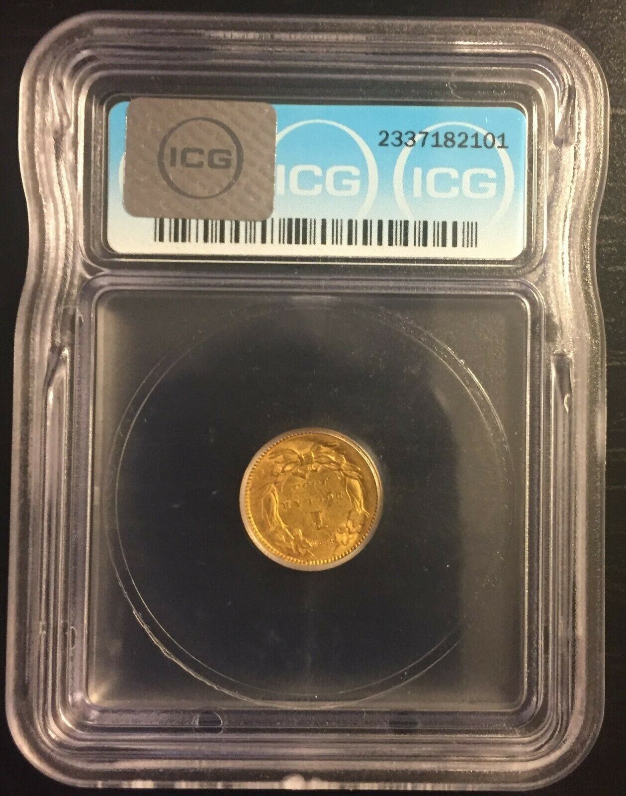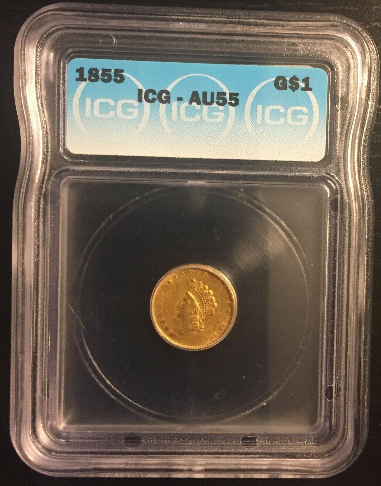 One 1855 $1 Type 2 Gold Coin ICG AU55.