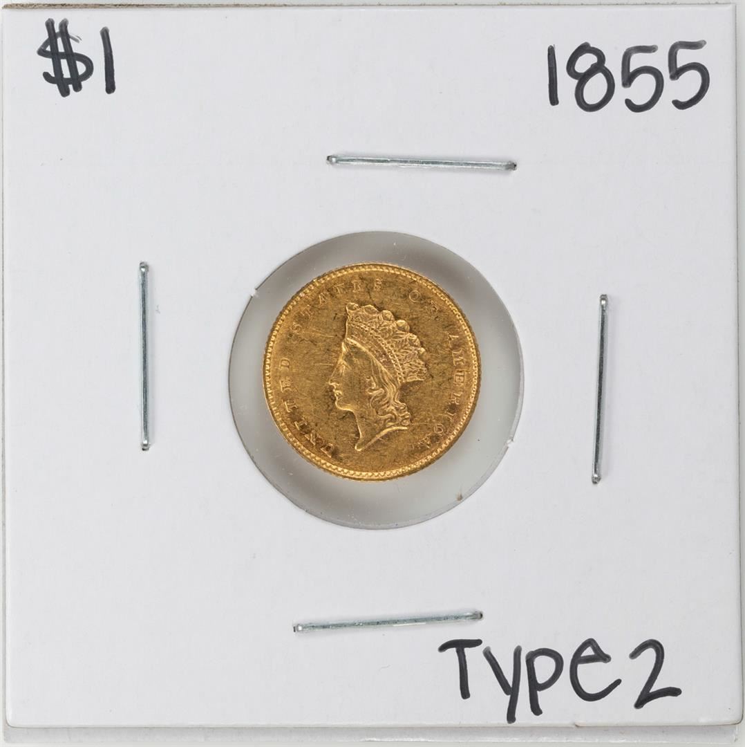 One 1855 $1 Type 2 Indian Princess Head Gold Dollar Coin.