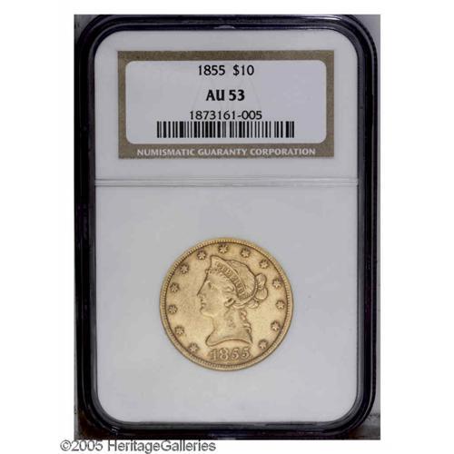 1855 $10 AU53 NGC. A lightly circulated and moderately 1855[$10] AU53 NGC.