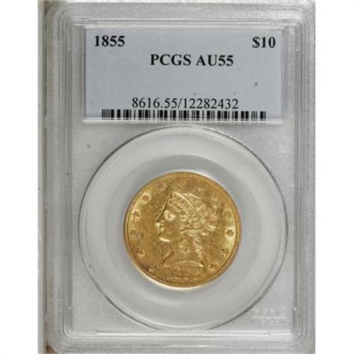 <B>1855 $10 AU55 PCGS.</B></I> . PCGS Population (23/27). NGC Census: (131/155). Mintage: 121,701. Numismedia Wsl. Price for NGC/PCGS coin in AU55: $750. (#8616)<BR><BR><B>Coin Engraver:</B> Christian Gobrecht<BR><BR><b>Shipping:</b> Coins & Currency (<a target="_blank" href="http://www.heritageauctions.com/common/shipping.php">view shipping information</a>)