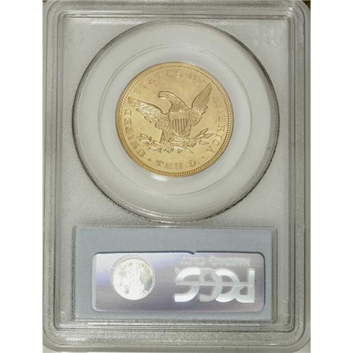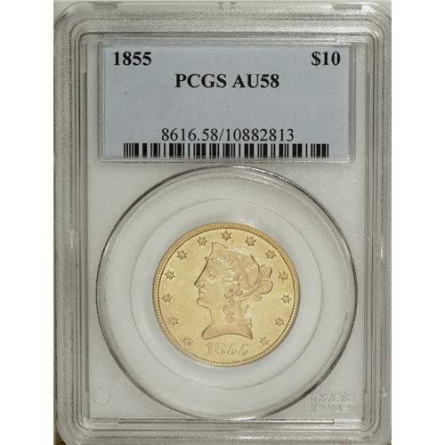 <B>1855 $10 AU58 PCGS.</B></I> A touch of friction keeps this solidly struck example from a Mint State grade. Still highly lustrous with only a few stray handling marks. Population: 13 in 58, 15 finer (10/06).<BR><BR><b>Shipping:</b> Coin/Currency (<a target="_blank" href="http://www.heritageauctions.com/common/shipping.php">view shipping information</a>)