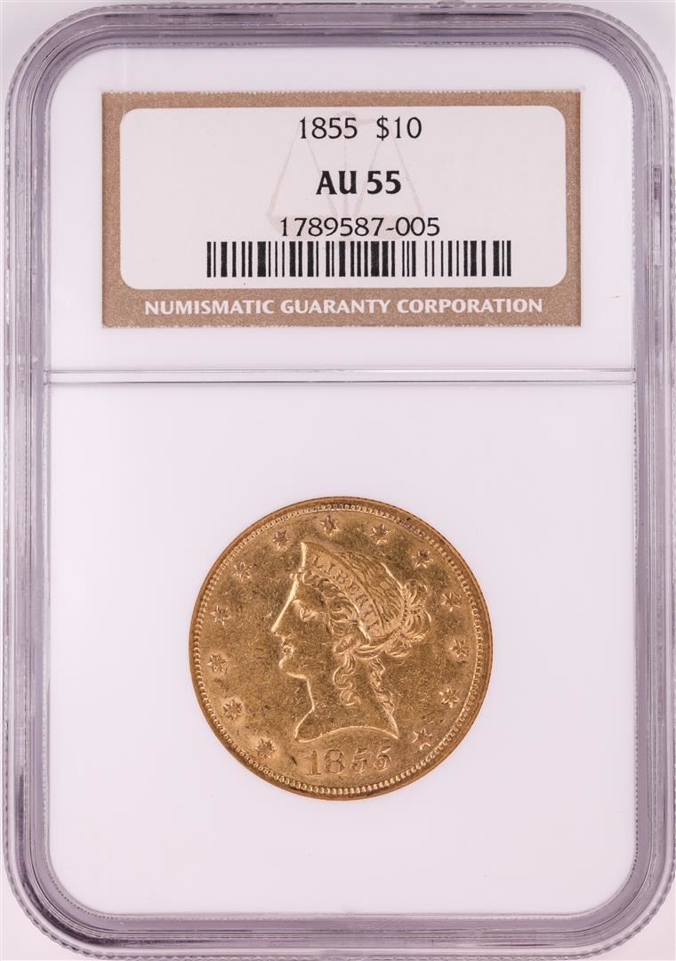 One 1855 $10 Liberty Head Eagle Gold Coin NGC AU55.