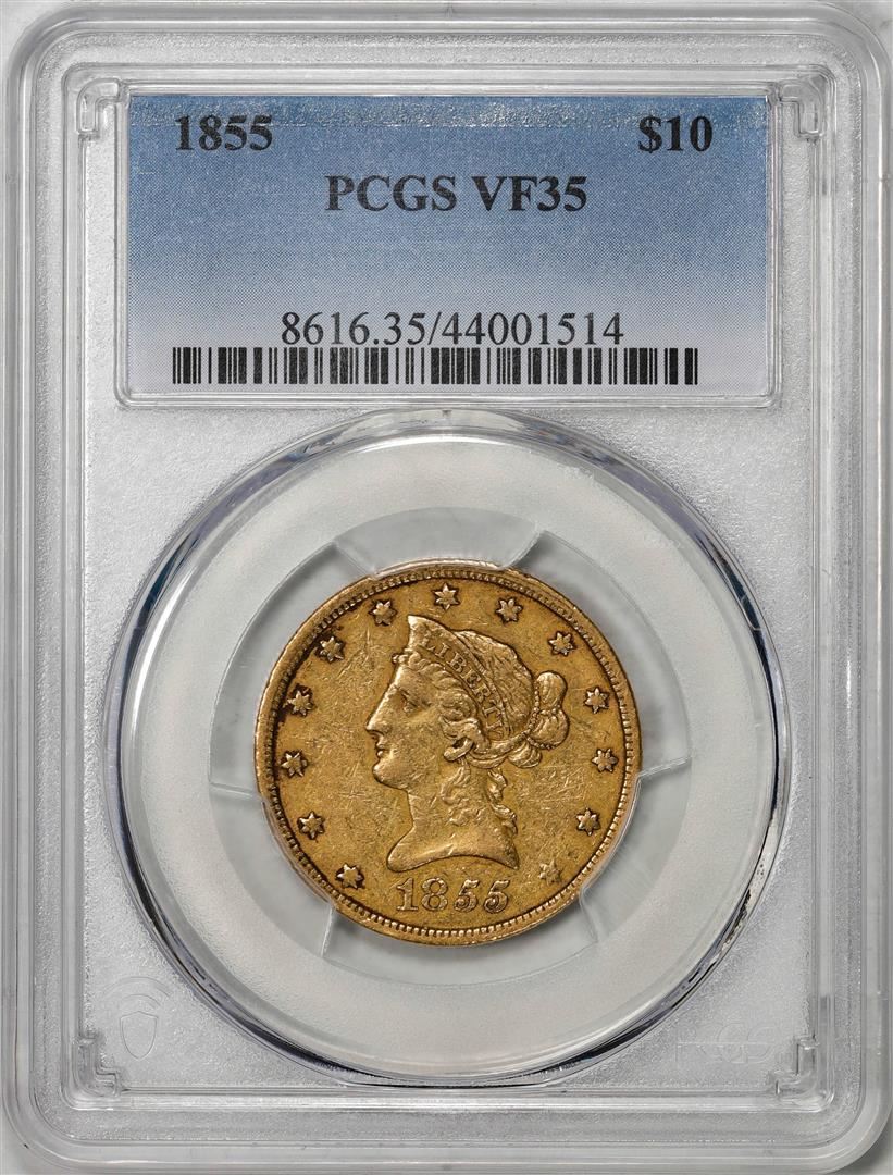 One 1855 $10 Liberty Head Eagle Gold Coin PCGS VF35. PCGS Graded.