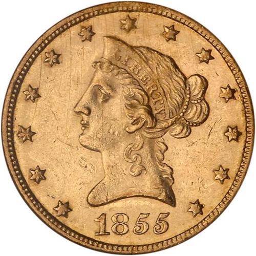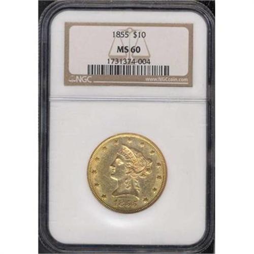 <b>1855 $10 Liberty. NGC graded MS60.</b> NGC Pop: 12/30. Well struck for the issue with the usual light abrasions and some striations but all in all a lustrous example. The issues of 1849 to 1854 tend to be the commonest P-mint dates in the No Motto period, but beginning in 1855, mintage declined somewhat and Mint condition specimens are rarely seen <b>(PCGS # 8616)</b> <i>
