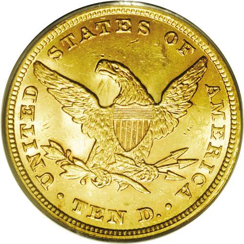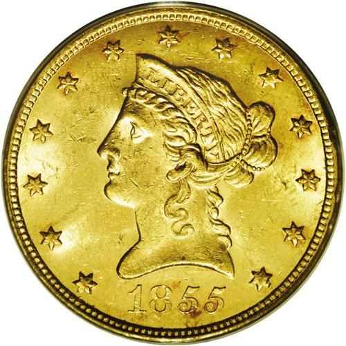 <B>1855<$10> MS62 PCGS.</B></I> No Motto eagles are readily obtained in circulated grades, but pieces with full mint luster are rare, and when found, are usually either the 1847 or 1861 issues. The 1855 has a mintage of only 121,701 pieces, and although XF and AU examples are plentiful, PCGS has certified just 15 examples in MS60 and higher grades. The present lustrous representative also benefits from a sharp strike, and the sole identifying mark is a short scrape in the field beneath the beak. Population: 5 in 62, 5 finer (4/06).
