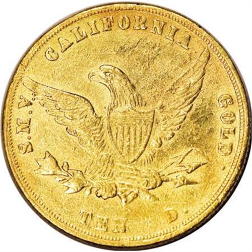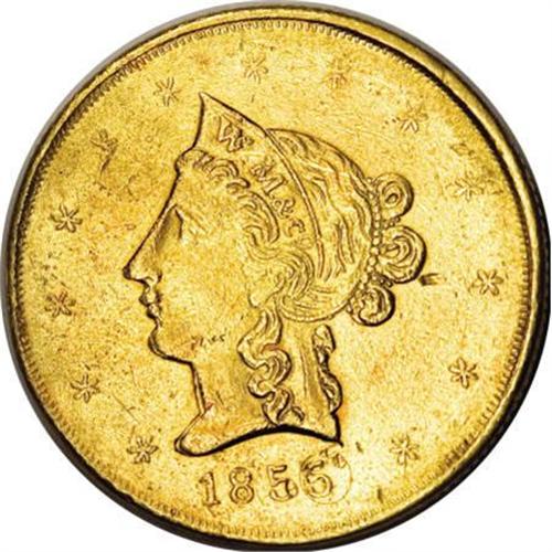 <B>1855 $10 Wass Molitor Ten Dollar MS60 Rim Filed, Cleaned Uncertified.</B></I> K-6, High R.5. At one time, this variety was considered R.7 with fewer than a dozen known, but after discovery of the treasure from the S.S. Central America, the rarity dropped dramatically. Although the surfaces are abraded with a matte-like appearance, there is no indication of wear on this lovely piece. A few moderate surface marks are visible, and light rim filing is evident, perhaps to smooth out a small rim bruise. It has been carefully cleaned or conserved. A small circular area at the last 5 in the date represents an alteration of the obverse die used to strike this piece. The die was previously dated 1852.<BR><BR><b>Shipping:</b> Coins & Currency (<a target="_blank" href="http://www.heritageauctions.com/common/shipping.php">view shipping information</a>)