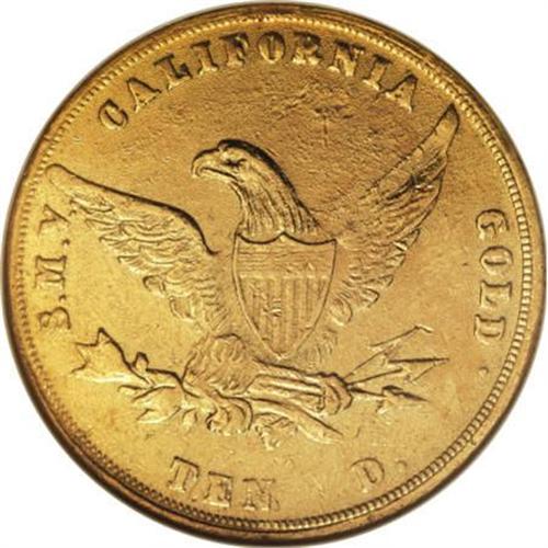 <B>1855 $10 Wass Molitor Ten Dollar MS60 NGC.</B></I> K-6, High R.5. A frosty Mint State piece with excellent central design elements and brilliant yellow-gold luster with a hint of greenish patina on both sides. The peripheral details are weakly defined as usual for the issue. The final digit of the date rests on a small circle, where a die leftover from 1852 was repaired. The final digit was drilled out of the die, it was plugged, and a new digit, a 5, was punched on top. That die was then put back in service to coin a limited quantity of 1855 Wass-Molitor eagles. Listed on page 361 of the 2008 <I>Guide Book</B></I>. <BR><BR><b>Shipping:</b> Coins & Currency (<a target="_blank" href="http://www.heritageauctions.com/common/shipping.php">view shipping information</a>)