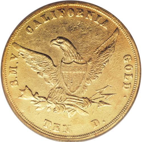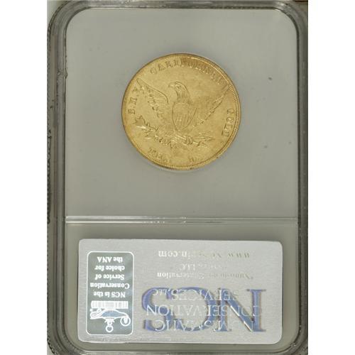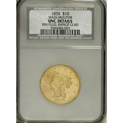<B>1855 $10 Wass Molitor Ten Dollar--Rim Filed, Improperly Cleaned--NCS. Unc Details.</B></I> K-6, High R.5. At one time, this variety was considered R.7 with fewer than a dozen known, but after discovery of the treasure from the <I>S.S. Central America,</B></I> the rarity dropped dramatically. Although the surfaces are abraded, there is no indication of wear on this lovely piece. A few moderate surface marks are visible, and light rim filing is evident, perhaps to smooth out a small rim bruise. A small circular area at the last 5 in the date represents an alteration of the obverse die used to strike this piece. The die was previously dated 1852.<BR><BR><b>Shipping:</b> Coins & Currency (<a target="_blank" href="http://www.heritageauctions.com/common/shipping.php">view shipping information</a>)