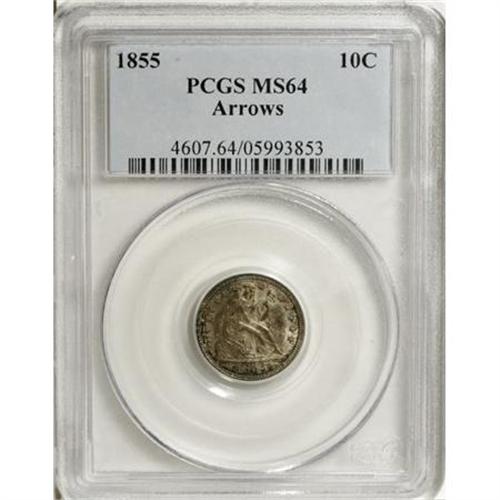 <B>1855 10C Arrows MS64 PCGS.</B></I> Dusky silver-gray and violet shades grace the satiny surfaces of this Arrows near-Gem. Well-defined for the issue with only a few minor flaws in the fields. Population: 9 in 64, 10 finer (8/07).<B><BR></B></I><I>From The Beau Clerc Collection.</B></I><BR><BR><B>Coin Engraver:</B> Christian Gobrecht<BR><BR><b>Shipping:</b> Coins & Currency (<a target="_blank" href="http://www.heritageauctions.com/common/shipping.php">view shipping information</a>)