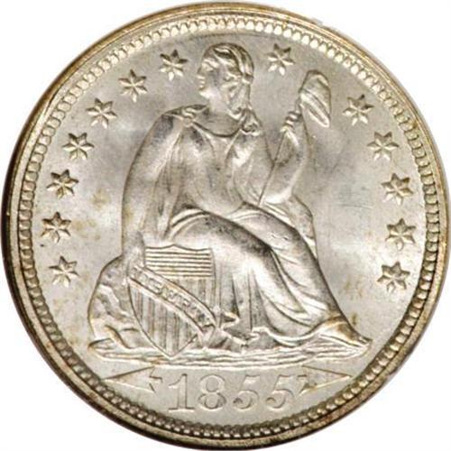 <B>1855 10C Arrows MS68 NGC.</B></I> This beautiful Superb Gem type coin is close to brilliant, although faint tan toning is present here and there. Well struck aside from the reverse dentils near 6 o'clock. The preservation is outstanding, since careful evaluation is necessary to locate the occasional faint grazes. Arrows dimes were struck for only three years, 1853 to 1855. By 1849, West Coast gold was mined in sufficient quantity to increase the relative value of silver. Silver coins were promptly hoarded and melted. The Mint responded by reducing the weight of silver coins in 1853, which allowed them to circulate. Arrows were added to the date to denote the new tenor. The 1853 production was prodigious to end the shortage of silver in circulation, but by 1855, mintages were reduced to normal levels and Mint State pieces are elusive. Census: 2 in 68, 0 finer (1/08).<BR><I>From The Southwest Collection.</B></I><BR><BR><B>Coin Engraver:</B> Christian Gobrecht<BR><BR><b>Shipping:</b> Coins & Currency (<a target="_blank" href="http://www.heritageauctions.com/common/shipping.php">view shipping information</a>)