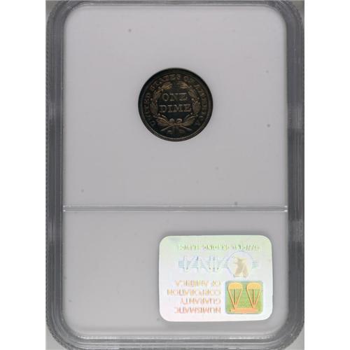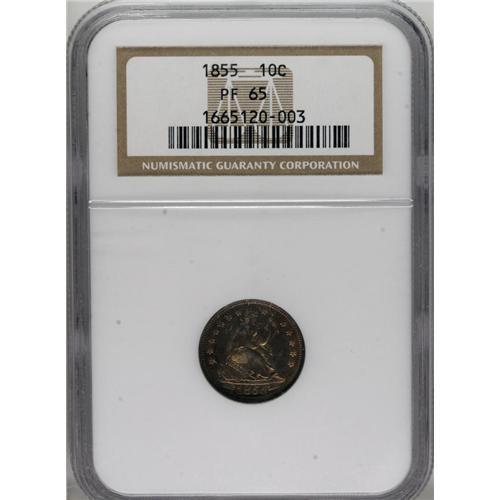 <B>1855 10C Arrows PR65 NGC.</B></I> Breen-3290. "Obvious double date. Proof only. Very rare." All of the With Arrows coinage types are rare in proof format, regardless of the date. This is true of all denominations from half dime through half dollar. From an unknown number minted, just 18 proof dimes of 1855 have been certified by NGC and PCGS combined; among all the specialized collections of dimes sold over the past century, few have included an example. This beautiful Gem displays deep burnt-sienna coloration with attractive bronze-gold accents on the highpoints. All of the design elements are boldly rendered. The surfaces are exquisitely preserved, with a couple of minuscule nicks noted for accuracy's sake just above the M in DIME. NGC Census: 3 in 65, 0 finer (4/07).<BR><BR><b>Shipping:</b> Coins & Currency (<a target="_blank" href="http://www.heritageauctions.com/common/shipping.php">view shipping information</a>)