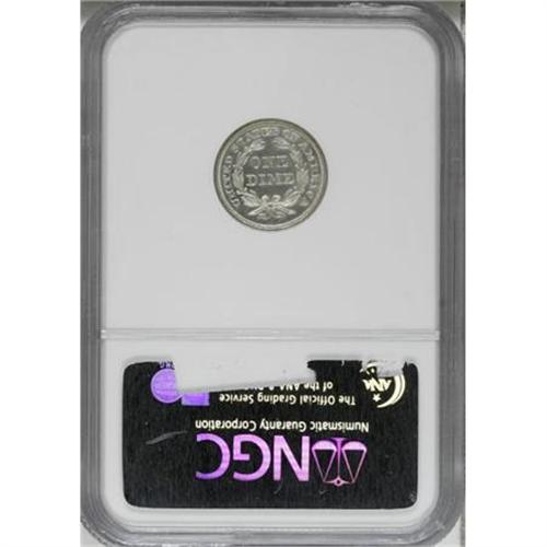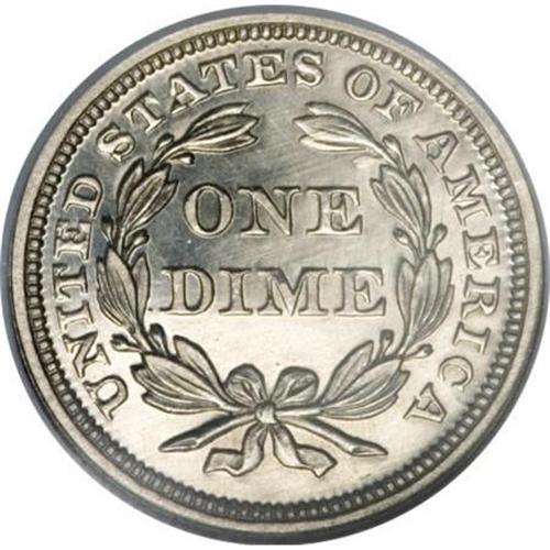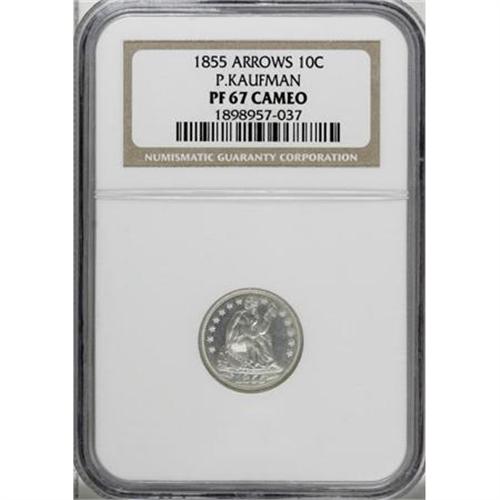 <B>1855 10C Arrows PR67 Cameo NGC.</B></I> Ex: P. Kaufman. The 1855 Arrows proof dime out of the Phil Kaufman Collection ranks among the finest of 29 certified pieces. Moreover, it is one of just four examples assigned the Cameo designation by NGC and PCGS. The level of preservation of extant pieces is relatively high, most falling into the PR64-PR65 range.<BR> The mintage figure for this issue is unknown. While Walter Breen (1989) accounted for nine examples, including one in the Smithsonian Institution, our survey of previous catalogs with 1855 proof dime appearances suggests that most numismatists estimate 12-15 coins existing. The one exception is David Lawrence Rare Coins, which suggests there are probably about 30 proofs of this date extant. <BR> Our research reveals what we believe to be nine separate examples, plus the Smithsonian specimen. The photo quality of many catalog appearances made plate-matching difficult. Some listings in the roster may represent the same coin:<BR><B><BR> 1. PR67 <img src="/images/star.gif" width="10" height="10" alt="" border="0"></B></I> <B>Cameo NGC.</B></I> An example in the present sale.<B> <BR> 2. PR67 Cameo NGC. The Kaufman example.</B></I> This coin appears different than any of the following.<BR><B> 3. PR65 NGC. </B></I>Allen Lovejoy Collection (Stack's, 10/1990), lot 283.<BR><B> 4. PR65.</B></I> Eliasberg Collection (Bowers and Merena, 5/1996), lot 1151.<BR><B> 5. PR65 PCGS.</B></I> 2000 ANA Money Show (Superior, 3/2000), lot 280; J.B. Worthington Collection (American Numismatic Rarities, 5/2005), lot 136.<BR><B> 6. PR64 NGC.</B></I> Rarities Sale (Bowers and Merena, 8/1996), lot 79.<BR><B> 7. PR64 PCGS.</B></I> Pre-Long Beach (Superior, 10/2000), lot 4346.<BR><B> 8. PR64 PCGS.</B></I> Long Beach (Heritage, 2/2005), lot 6240. Pedigree markers visible on the plates include a carbon spot left of star 5, another under the cap, and one to the upper right of the reverse branch.<BR><B> 9. PR64 NGC.</B></I> Richmond III Sale (David Lawrence Rare Coins, 3/2005), lot 1247.<BR><B> 10. Choice Brilliant Proof.</B></I> Floyd T. Starr Collection (Stack's, 10/1992), lot 370.<BR><B> 11. Proof.</B></I> Smithsonian Institution.<BR><BR>Additional Appearances<BR> A. PR65 NGC. Orlando Sale (Superior, 8/1992), lot 93.<BR> B. PR65 NGC. Central States Sale (Heritage, 5/2007), lot 2071.<BR> C. PR64 PCGS. 1997 FUN Sale (Heritage, 1/1997), lot 5909.<BR> D. PR64 NGC. Rarities Sale (Bowers and Merena, 8/1998), lot 110.<BR> E. PR64 PCGS. Pre-Long Beach (Ira and Larry Goldberg, 6/2002), lot 2151.<BR> F. PR64 NGC. Stack's (9/2006), lot 479.<BR> G. Choice Proof 63/63. 1986 Georgia Numismatic Association Sale (Mid-American, 5/1986), lot 1542.<BR> H. Proof. John Jay Pittman Collection (David Akers, 10/1997), lot 621.<BR><BR> Stunning Cameo contrast is evident on the Superb Gem Kaufman coin, regardless of the angle from which the piece is viewed. An exacting strike imparts strong definition to the design features, except for minor softness on the ribbing of the upper-most leaves. A few stray inoffensive hairlines on the untoned, nicely preserved surfaces should not be confused with the faint die polish lines visible in the fields.<BR><I>From The Phil Kaufman Collection of Early Seated Proof Sets, Part Three.</B></I><BR><BR><b>Shipping:</b> Coins & Currency (<a target="_blank" href="http://www.heritageauctions.com/common/shipping.php">view shipping information</a>)