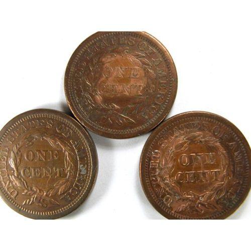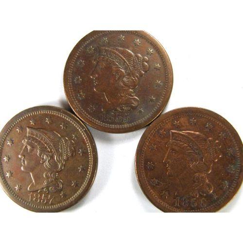 1855 Upright 55, 1856 Upright 5 and 1857 Large Date. Three pieces, all EF