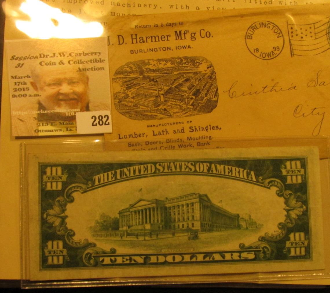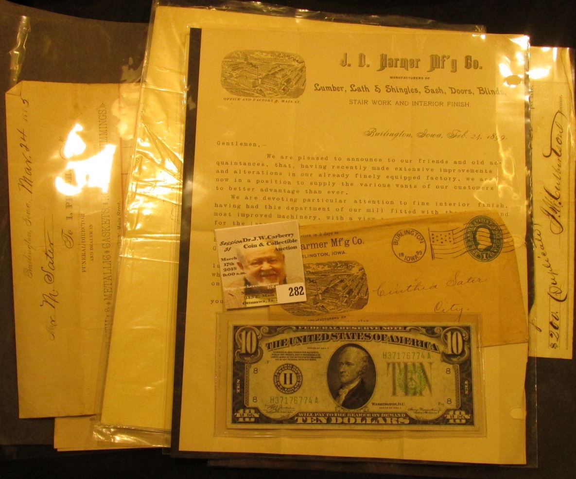 1855-1899 Memorabilia from Eastern Iowa including receipts, stamped Cover, and advertising letterheads; & Series 1934A $10 Federal Reserve Note with "H" from St. Louis, Mo., plate numbers F64 & 875m EF.