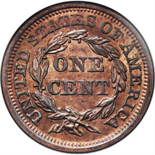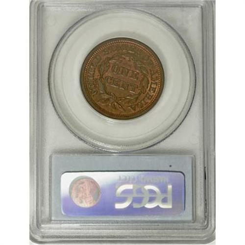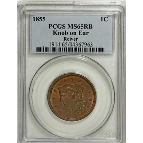 <B>1855 1C Knob on Ear MS65 Red and Brown PCGS.</B></I> N-9, R.1. Grellman state d. An earlier die state of this popular variety, with the knob still in its developing stages. Cracks have outlined the knob between Liberty's ear and the letter T, and this break is beginning to rise above the surface of the hair strands, but has not yet expanded over to the Y of LIBERTY. Grellman state d. Deep orange mint color is visible on both sides, a shade or two lighter on the reverse. At least 50% of the original color remains, although this is so nicely and attractively blended with light brown toning that it is difficult to pinpoint an exact percentage of red color. Exceptional surfaces with full cartwheel luster. EAC 63. Population: 1 in 65, 0 finer (8/07).<BR><I>Ex: Del Bland (7/19/1969); Jules Reiver (Heritage, 1/2006), lot 20620.</B></I><BR><BR><B>Coin Engraver:</B> Christian Gobrecht<BR><BR><b>Shipping:</b> Coins & Currency (<a target="_blank" href="http://www.heritageauctions.com/common/shipping.php">view shipping information</a>)