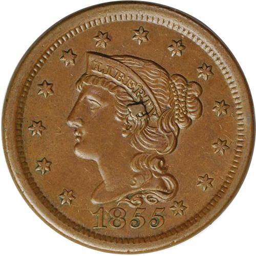 <B>1855<1C> Knob on Ear. N-9, R.1. MS62 Brown NGC. AU50 EAC.</B></I> Grellman state f. A second break has begun to form below Y. Pleasing chestnut and olive brown color.<BR><I>Ex: Stack's (11/22/1986).</B></I>