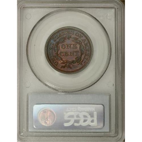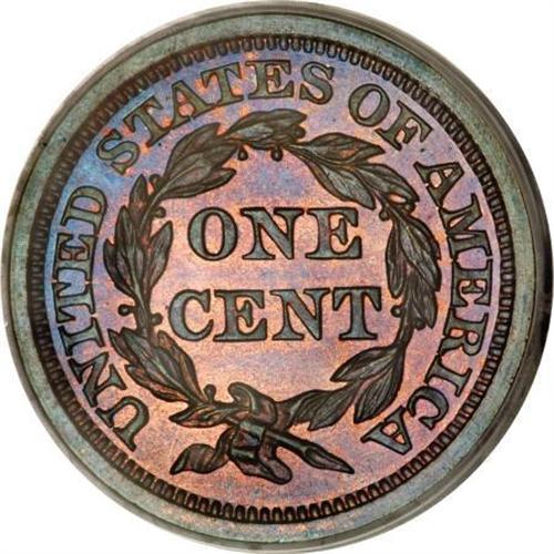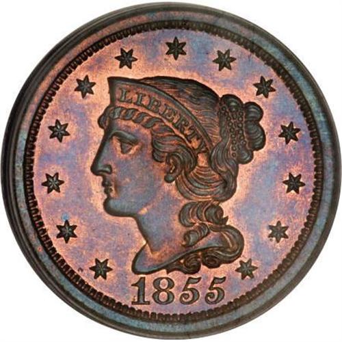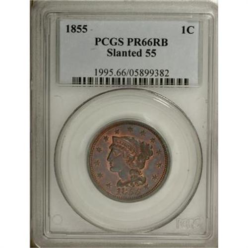 <B>1855 1C Slanted 55 PR66 Red and Brown PCGS.</B></I> N-10, R.5 as a proof. This variety is attributed by the point of the curl right of center of the 8 in the date, a strong point down to the left from the edge of the coronet, and a line from the dentils down to the left side of the O in OF. <BR> PCGS and NGC have seen a total of 12 Red and Brown specimens, the coin in this lot and two others being the finest known of this color designation. Only one fully red example has been certified (NGC PR64).<BR> Bright orange surfaces are imbued with traces of sky-blue and crimson, and are immaculately preserved. Additionally, an attentive strike results in crisp definition on the design elements. A lovely Premium Gem proof large cent. EAC PR64.<BR><BR><B>Coin Engraver:</B> Christian Gobrecht<BR><BR><b>Shipping:</b> Coins & Currency (<a target="_blank" href="http://www.heritageauctions.com/common/shipping.php">view shipping information</a>)