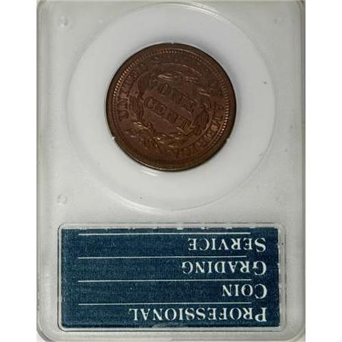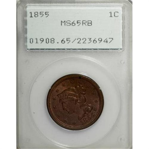 <B>1855 1C Slanting 5s MS65 Red and Brown PCGS.</B></I> N-10, R.1. This splendidly struck brick-red Gem exhibits pleasing satin luster, and lacks any mentionable marks. A tiny obverse spot at 1:30 is all that limits the grade. Housed in a first generation holder. EAC 60.<BR><BR><B>Coin Engraver:</B> Christian Gobrecht<BR><BR><b>Shipping:</b> Coins & Currency (<a target="_blank" href="http://www.heritageauctions.com/common/shipping.php">view shipping information</a>)