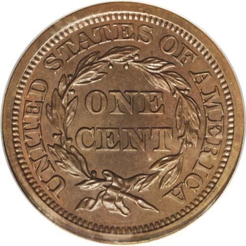 <B>1855<1C> Slanting 5s PR63 Brown PCGS.</B></I> N-10, R.5 as a proof. A tiny die chip on the left edge of the coronet identifies the Newcomb variety. This intricately struck chocolate-brown specimen has a minor mark on the base of the neck and a few subtle spots, the most noticeable right of star 13. EAC PR60. Population: 3 in 63, 5 finer (9/06).