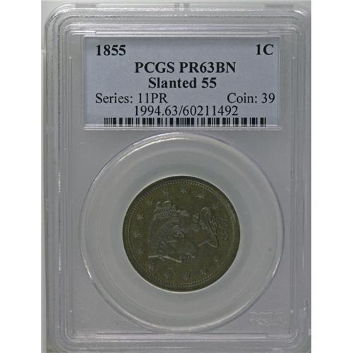 1855 1C Slanting 5s PR63 Brown PCGS. N-10, R.5 as a pr