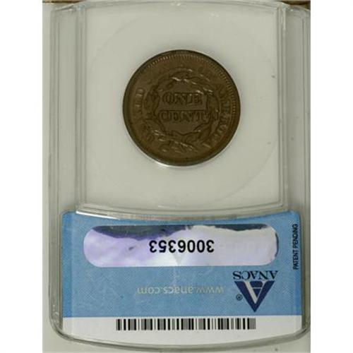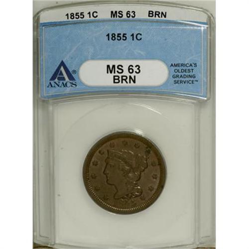 <B>1855 1C Upright 5s MS63 Brown ANACS.</B></I> NGC Census: (65/279). PCGS Population (65/122). Mintage: 1,574,829. Numismedia Wsl. Price for NGC/PCGS coin in MS63: $192. (#1907)<BR><BR><B>Coin Engraver:</B> Christian Gobrecht<BR><BR><b>Shipping:</b> Coins & Currency (<a target="_blank" href="http://www.heritageauctions.com/common/shipping.php">view shipping information</a>)