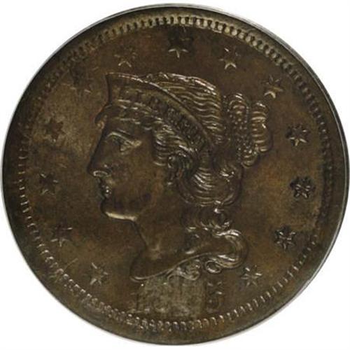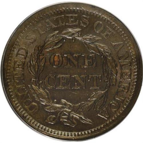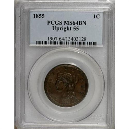 <B>1855 1C Upright 5s MS64 Brown PCGS.</B></I> PCGS Population (84/39). NGC Census: (139/141). Mintage: 1,574,829. Numismedia Wsl. Price for NGC/PCGS coin in MS64: $280. (#1907)<BR><BR><B>Coin Engraver:</B> Christian Gobrecht<BR><BR><b>Shipping:</b> Coins & Currency (<a target="_blank" href="http://www.heritageauctions.com/common/shipping.php">view shipping information</a>)