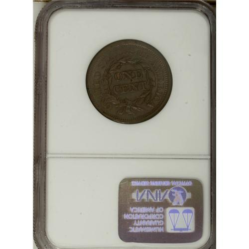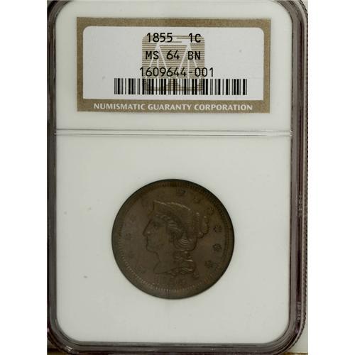 <B>1855 1C Upright 5s MS64 Brown NGC.</B></I> N-3, R.1. Grellman Die State b. This chocolate-brown cent has smooth surfaces. The major devices are crisply struck, although the left-side stars are soft. The reverse rim is scraped. EAC 40.<BR><BR><b>Shipping:</b> Coins & Currency (<a target="_blank" href="http://www.heritageauctions.com/common/shipping.php">view shipping information</a>)