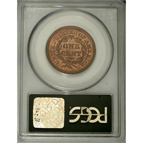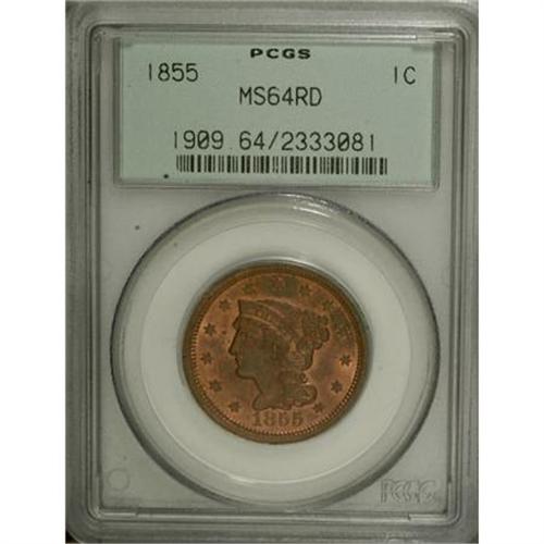 <B>1855 1C Upright 5s MS64 Red PCGS.</B></I> N-4, R.1. Small lumps on Liberty's jaw to the left of the earlobe are diagnostic for the variety. A well struck and lustrous Choice piece that shows ample copper-orange with elements of violet and minimal carbon. An inconspicuous strike-through is noted above ONE. In an old green label holder. EAC 63.<BR><BR><B>Coin Engraver:</B> Christian Gobrecht<BR><BR><b>Shipping:</b> Coins & Currency (<a target="_blank" href="http://www.heritageauctions.com/common/shipping.php">view shipping information</a>)