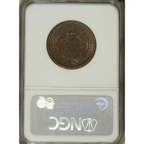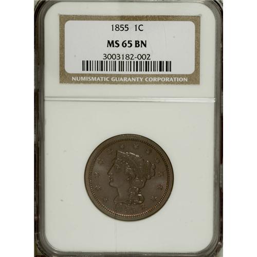 <B>1855 1C Upright 5s MS65 Brown NGC.</B></I> N-4, R.1. This glossy piece is predominately chocolate-brown, but ample mint red remains near design elements, particularly on the reverse. The major devices are crisply struck, and the preservation is exemplary aside from a hair-thin horizontal line on the cheek. A couple of small hairs cling to the reverse field. EAC 60.<BR><BR><b>Shipping:</b> Coins & Currency (<a target="_blank" href="http://www.heritageauctions.com/common/shipping.php">view shipping information</a>)