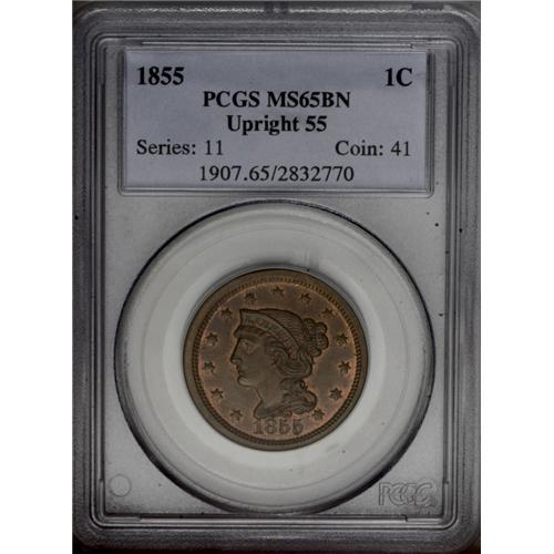 1855 1C Upright 5s MS65 Brown PCGS. N-4, R.1. Die Stat