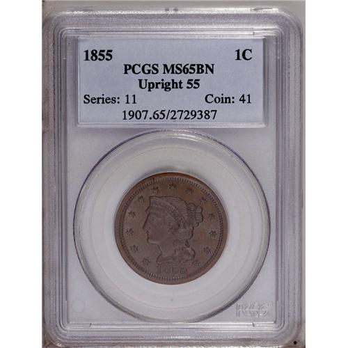 1855 1C Upright 5s MS65 Brown PCGS. N-4, R.1. GDS a. T 1855[1C] Upright 5s MS65 Brown PCGS.