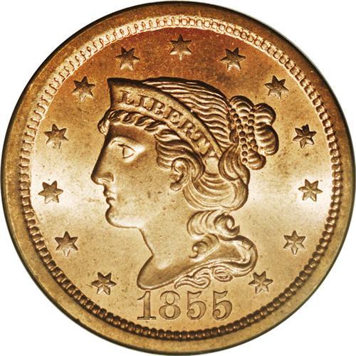 <B>1855 1C Upright 5s MS65 Red PCGS.</B></I> N-4. Full blazing red on both sides and quite attractive. The surfaces are clean as expected, lacking the abrasions so often found on this issue. No disturbing spots are present, and carbon flecks are minimal. Housed in a green insert PCGS holder. EAC 65. Population: 74 in 65, 13 finer (1/06).