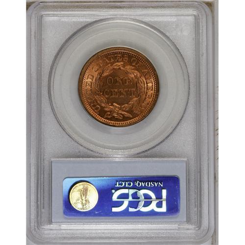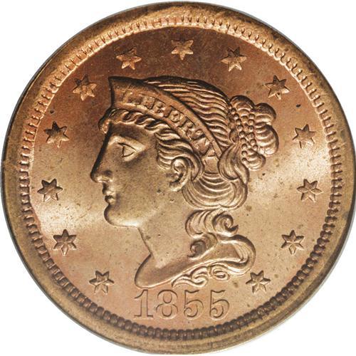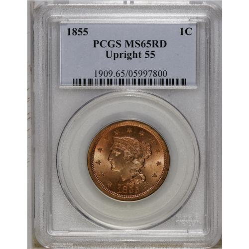 1855 1C Upright 5s MS65 Red PCGS. N-4, R.1. Die State