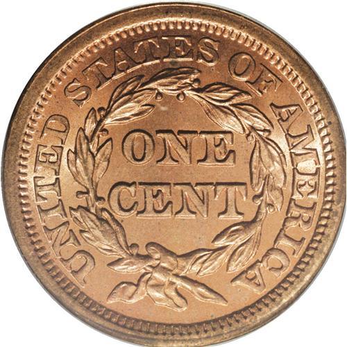 <B>1855 1C Upright 5s MS65 Red PCGS.</B></I> N-4, R.1. Die State A. Cherry-red and salmon-pink shades dominate this lustrous and nearly unabraded Gem. Minor carbon, including a spot beneath the E in STATES, is all that limits the grade. A few of the upper stars are soft, but the major devices are boldly brought up. EAC 60.<BR><BR><b>Shipping:</b> Coin/Currency (<a target="_blank" href="http://www.heritageauctions.com/common/shipping.php">view shipping information</a>)