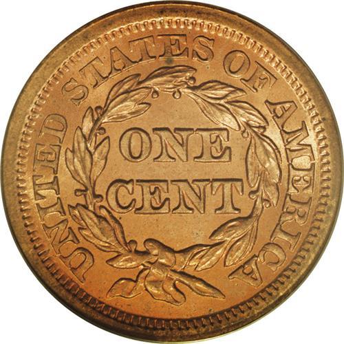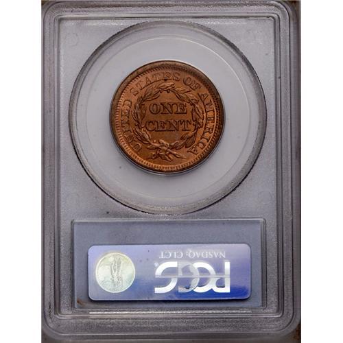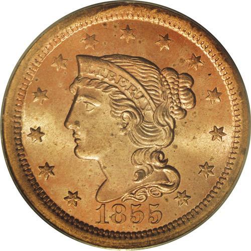 1855 1C Upright 5s MS65 Red PCGS. N-4, R.1. Fully red