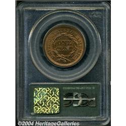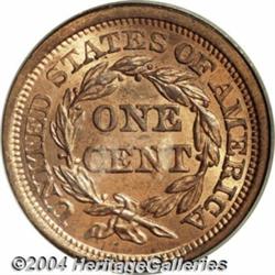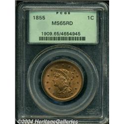 <B>1855<1C> Upright 5s MS65 Red PCGS.</B></I> N-4, R.1. Tiny die lumps on Liberty's cheek confirm the N-4 die marriage. Bright red color provides pleasing eye appeal, although the reverse field above and to the left of ONE has a hint of muting. This nicely struck Gem would have claims to a higher grade save for a faint squiggly mark Liberty's cheek. Population: 72 in 65, 14 finer (3/04). <BR><BR><B>Important notice:</B> Heritage usually auctions material at the rate of 200-250 lots per hour. On some occasions eBay Live bid software or the Internet may not be able to keep up with the pace of the auction. We recommend placing a realistic absentee bid now as insurance to avoid disappointment. Occasionally the auctioneer may eliminate or reject an eBay Live bid, and the auctioneer may also reopen a lot after the close of the eBay live bidding (usually because we missed an audience bid), and may reject your bid even if it shows you as the winning bidder. By bidding via eBay Live, you agree that Heritage may award the lot to another bidder at its sole discretion under the circumstances described above or any other reasonable circumstances. Since eBay bids are not shown to us until we open the lot on the floor, we treat those bids just like floor bids. In most cases the floor responds before the eBay bid is presented to us, due to Internet lag time, so for consistency we have made it a policy that floor bids are always considered first over tie eBay live bids. Also please note that all Heritage lots purchased through eBay Live carry a 20% Buyer's Premium. Please make sure you read the Terms and Conditions before you bid. </span></font></tr></table></td></tr></table>