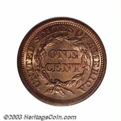 <TR><TD width="100%"><TABLE cellSpacing=1 cellPadding=3 width="100%" border=0><TBODY><TR><TD width="100%" bgColor=#79735c><FONT face=arial color=#ffffff size=3><B>Description</B> </FONT></TD></TR><TR><TD width="100%" bgColor=#ffffff><FONT face=arial size=2><B>1855 1C Upright 5s MS65 Red PCGS.</B></I> Very sharply defined on the device of Liberty with the characteristic softness usually seen on the peripheral details. Full, even red color covers both sides of this lovely, solidly graded Braided Hair Large Cent. An outstanding type coin. </FONT></TD></TR></TBODY></TABLE></TD></TR></TBODY></TABLE><BR><A name=PricesRealized></A><TABLE cellSpacing=0 cellPadding=0 width="100%" bgColor=#000000 border=0><TBODY><TR><TD width="100%"><TABLE cellSpacing=1 cellPadding=3 width="100%" border=0><TBODY><TR><TD width="100%" bgColor=#79735c><A name=PR><FONT face=arial color=#ffffff size=3><B>Previous Prices from Heritage Auctions</B> </FONT></A></TD></TR><TR><TD bgColor=#f6f6ed><TABLE cellSpacing=0 cellPadding=0 width="100%" border=1><TBODY><TR><TD align=middle width="33%"><B>Date</B></TD><TD align=middle width="33%"><B>Service</B></TD><TD align=middle width="33%"><B>Price</B></TD></TR><TR bgColor=whitesmoke><TD width="33%"><B>01/11/2003</B></TD><TD width="33%">PCGS</TD><TD width="33%">$2,185.00</TD></TR><TR bgColor=whitesmoke><TD width="33%"><B>08/08/2001</B></TD><TD width="33%">PCGS</TD><TD width="33%">$2,415.00</TD></TR><TR bgColor=whitesmoke><TD width="33%"><B>08/17/1996</B></TD><TD width="33%">PCGS</TD><TD width="33%">$2,090.00</TD></TR><TR bgColor=whitesmoke><TD width="33%"><B>03/13/1999</B></TD><TD width="33%">PCGS</TD><TD width="33%">$2,185.00</TD></TR><TR bgColor=whitesmoke><TD width="33%"><B>04/11/1997</B></TD><TD width="33%">PCGS</TD><TD width="33%">$3,740.00</TD></TR><TR bgColor=whitesmoke><TD width="33%"><B>02/24/1995</B></TD><TD width="33%">PCGS</TD><TD width="33%">$1,980.00</TD></TR><TR bgColor=whitesmoke><TD width="33%"><B>07/30/2002</B></TD><TD width="33%">NGC</TD><TD width="33%">$1,840.00</TD></TR><TR bgColor=whitesmoke><TD width="33%"><B>06/05/1999</B></TD><TD width="33%">NGC</TD><TD width="33%">$1,705.00</TD></TR><TR bgColor=whitesmoke><TD width="33%"><B>03/23/2003</B></TD><TD width="33%">PCGS</TD><TD width="33%">$2,357.50</TD></TR><TR bgColor=whitesmoke><TD width="33%"><B>08/19/1995</B></TD><TD width="33%">NGC</TD><TD width="33%">$1,430.00</TD></TR></TBODY></TABLE></TD></TR><TR><TD bgColor=#ffffff><FONT face=arial size=1 ?>PLEASE NOTE: All prices realized reflect the final hammer price PLUS the buyer's premium in auctions that charge a buyer's premium. Each item has a notation at the top of the listing indicating whether that lot included a buyer's premium. Example: A item that sells with a final hammer price of $100 and a 20% buyer's premium will display with a price realized of $120. All information listed is intended to be as accurate as possible, but errors are possible. Please use this guide carefully and inform us of any inaccuracies. </FONT></TD></TR></TBODY></TABLE></TD></TR></TBODY></TABLE><BR><TABLE cellSpacing=0 cellPadding=0 width="100%" bgColor=#000000 border=0><TBODY><TR><TD width="100%"><TABLE cellSpacing=1 cellPadding=3 width="100%" border=0><TBODY><TR><TD width="100%" bgColor=#79735c colSpan=6><FONT face=arial color=#ffffff size=3><B>Price Guide*</B> </FONT></TD></TR><TR bgColor=#f6f6ed><TD align=middle><B>Grade</B> </TD><TD align=middle><B>Coin World<BR>(Trends)</B> </TD><TD align=middle><B>Numismedia<BR>Retail</B> </TD><TD align=middle><B>Numismedia<BR>Wholesale</B> </TD><TD align=middle><B>Coin<BR>Universe</B> </TD><TD align=middle><B>Heritage<BR>Value Index</B> </TD></TR><TR bgColor=#ffffff><TD align=middle>64</TD><TD align=right>---</TD><TD align=right>---</TD><TD align=right>$820.00</TD><TD align=right>$1,300.00</TD><TD align=right>$986.50</TD></TR><TR style="FONT-WEIGHT: bold" bgColor=#cccfdd><TD align=middle>65</TD><TD align=right>---</TD><TD align=right>---</TD><TD align=right>$2,375.00</TD><TD align=right>$3,500.00</TD><TD align=right>$2,277.50</TD></TR><TR bgColor=#ffffff><TD align=middle>66</TD><TD align=right>---</TD><TD align=right>---</TD><TD align=right>$4,400.00</TD><TD align=right>$7,500.00</TD><TD align=right>$5,250.00</TD></TR><TR bgColor=#ffffff><TD colSpan=6><FONT size=1>*All information listed is intended to be as accurate as possible, but errors are possible. No item may be returned or refused based on this information which is provided as a service to our customers. You should contact each pricing source directly to determine the accuracy of this information. </FONT></TD></TR></TBODY></TABLE></TD></TR></TBODY></TABLE><BR><TABLE cellSpacing=0 cellPadding=0 width="100%" bgColor=#000000 border=0><TBODY><TR><TD width="100%"><TABLE cellSpacing=1 cellPadding=3 width="100%" border=0><TBODY><TR><TD width="100%" bgColor=#79735c><FONT face=arial color=#ffffff size=3><B>Population Guide</B> </FONT></TD></TR><TR bgColor=#ffffff><TD align=middle><!-- Begin Output of Population Grid--><TABLE cellSpacing=0 cellPadding=0 width="100%" border=0><TBODY><TR><TD vAlign=center><TABLE cellSpacing=0 width="100%" border=1 cellsadding="3"><TBODY><TR><TD vAlign=center><TABLE cellSpacing=0 cellPadding=3 width="100%" border=1><TBODY><TR><TD vAlign=center align=middle bgColor=#f0f1e8 colSpan=2 <CENTER><FONT face=Arial size=2><B>PCGS Pop </B></FONT><CENTER></CENTER></TD><TD vAlign=center align=middle bgColor=#f0f1e8 colSpan=2><CENTER><FONT face=Arial size=2><B>NGC Pop</B></CENTER></FONT></TD></TR><TR><TD vAlign=center><FONT face=Arial size=2>(65)</FONT> </TD><TD vAlign=center align=right><FONT face=Arial size=2>71</FONT> </TD><TD vAlign=center><FONT face=Arial size=2>(65)</FONT> </TD><TD vAlign=center align=right><FONT face=Arial size=2>35</FONT> </TD></TR><TR><TD vAlign=center><FONT face=Arial size=2>(>65)</FONT> </TD><TD vAlign=center align=right><FONT face=Arial size=2>14</FONT> </TD><TD vAlign=center><FONT face=Arial size=2>(>65)</FONT> </TD><TD vAlign=center align=right