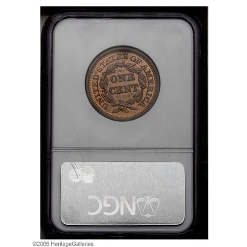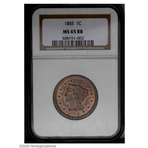 <B>1855<1C> Upright 5s MS65 Red and Brown NGC.</B></I> N-4, R.1. This variety is easily identified by several raised die lumps on the obverse portrait. Considerable mint orange is retained in the areas around, and within the crevices of, the design elements. Well struck, though most of the stars are soft in the centers. The surfaces are remarkably well preserved, and reveal no mentionable abrasions.