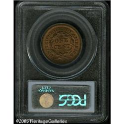 <B>1855 1C Upright 5s MS65 Red and Brown PCGS.</B></I> N-4, R.1. Pleasing orange patina, with a few wisps of light tan color, overlays lustrous surfaces that are devoid of any significant contact marks or unsightly spots. The design elements are well struck throughout, though several of the stars are soft in the center. Population: 59 in 65, 2 finer (1/05). Lot:5166