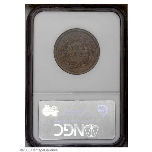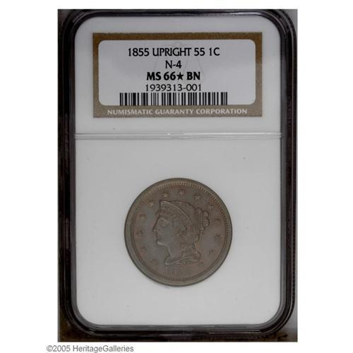 <B>1855<1C> Upright 5s MS66 Brown <S NGC.</B></I> N-4, R.1. A pair of die lumps show below Liberty's earlobe and a pair of faint die lines are within the N in CENT, these being used to confirm the Newcomb variety. Although designated as Brown, considerable orange-red luster outlines the stars and legends. Both sides are free from contact. Crisply struck aside from some of the denticles, and a void area (as struck) near nine o'clock on the reverse rim.